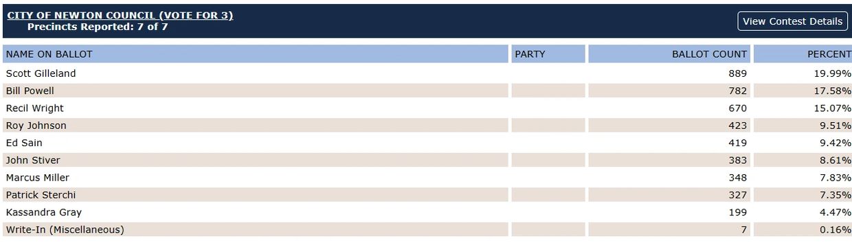 In an unprecedented landslide election, Scott Gilleland, Bill Powell and Recil Wright take seats on the Newton City Council. Gilleland and Powell receive vote totals in excess of all known previous vote totals and Wright wins over his nearest competitor by over 200 votes.